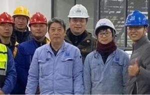 2020 年、現在進行中の中国上海汚泥処理(脱水・乾燥・焼却)施設試運転 監視・操作室にて、ヘルメットなしが佐々木 (試運転後半は新型コロナのため自宅から遠隔(TeamViewer)で試運転完了)